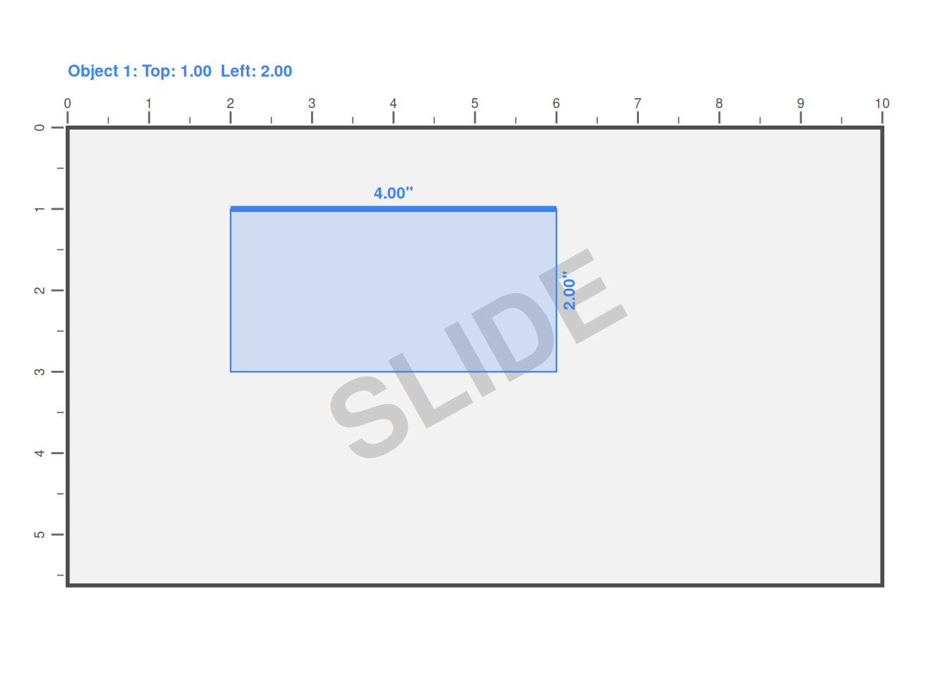 This creates a rectangle positioned 1 inch from the top of the slide and 2 inches from the left edge, with dimensions of 4 inches wide by 2 inches tall. The coordinate system follows standard conventions: positions are defined relative to the top-left corner of the slide, with top increasing downward and left increasing to the right.